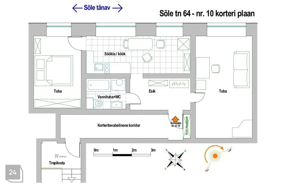Müüa hubane ja väga soe 2-toaline korter pindalaga 50,9 m², mis asub 4. korrusel tellismajas aadressil Sõle 64, Põhja-Tallinnas. Korter koosneb kahest toast, avarast köögist ning müüakse koos mööbli ja tehnikaga. Aknad avanevad rohelisele tänavale, hoovis on suletud territoorium kindla parkimiskoha ja laste mänguväljakuga. Majas on oma gaasikatel, mis võimaldab elanikel ise küttesüsteemi reguleerida; soe vesi tuleb boilerist. Vannitoa ja magamistoa kapitaalremont tehti 4–5 aastat tagasi. Korteris on paigaldatud naturaalsest puidust siseuksed, aknalauad ja köögimööbel.