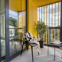 Korteris on avatud köögiga elutuba, mille suured, maast laeni aknad avanevad kahte suunda. Elutoast pääseb 5,5 m2 suurusele rõdule. Rõdule paistab pärastlõuna- ja õhtupäike. Disainkorteris on kasutatud on standardist kallimaid materjale.