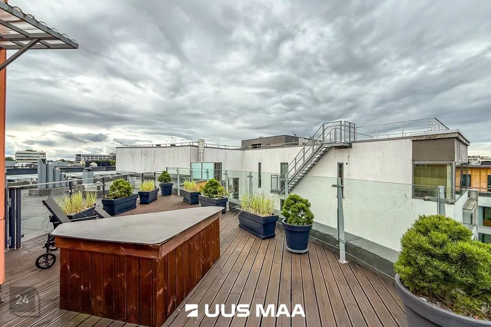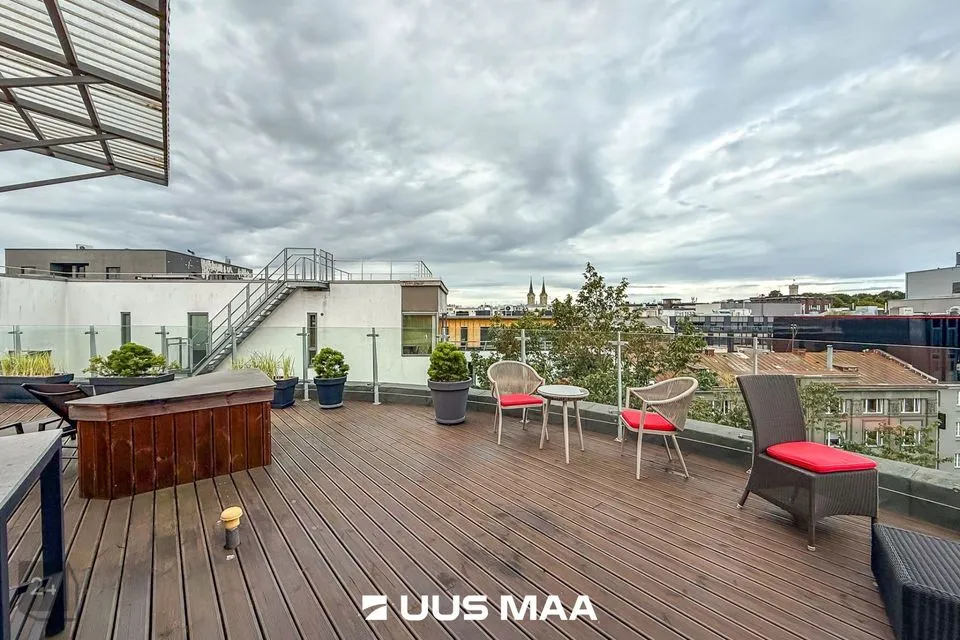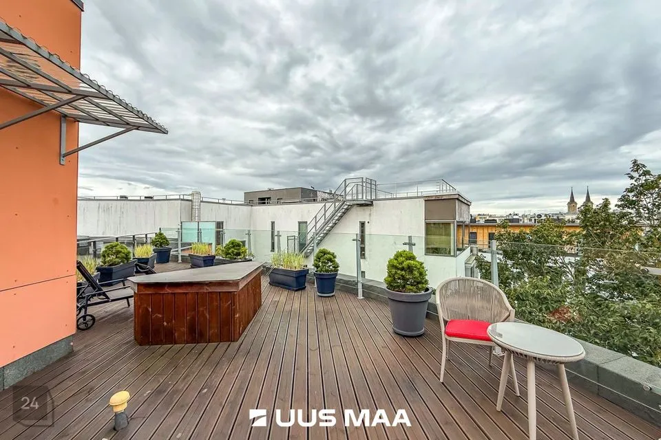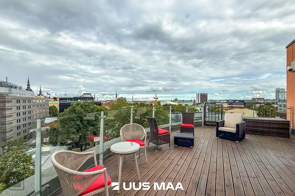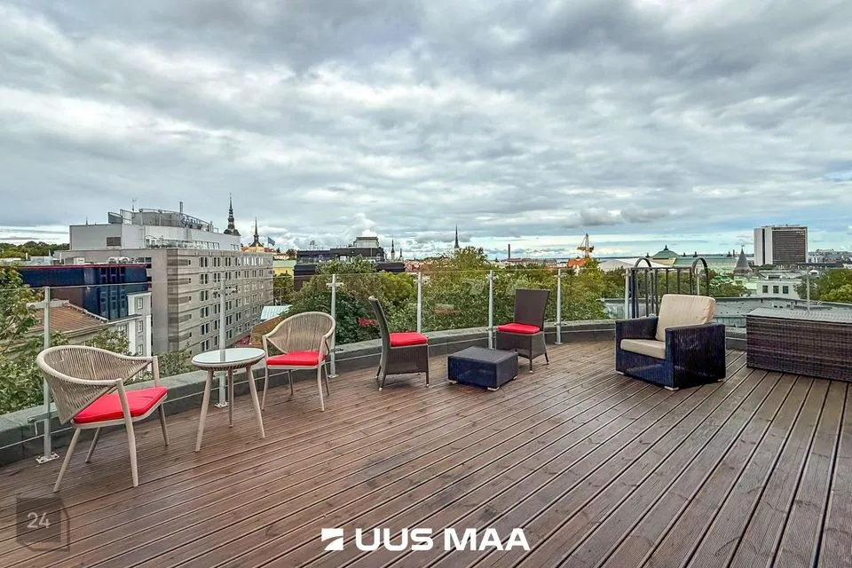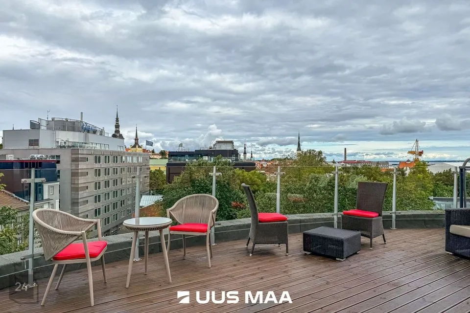 Korteri juurde kuulub suurepärane võimalus ühiselt naabritega kasutada päikeselist kaunite vaadetega katuseterrassi, millelt on näha Vanalinna kirikutorne, südalinna tänavaid ja pargirohelust.