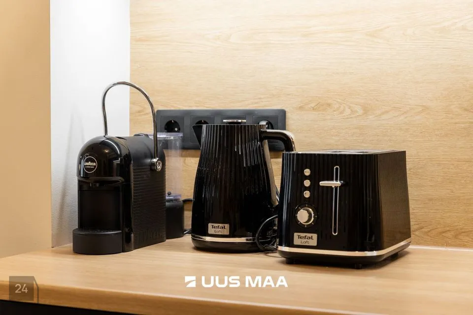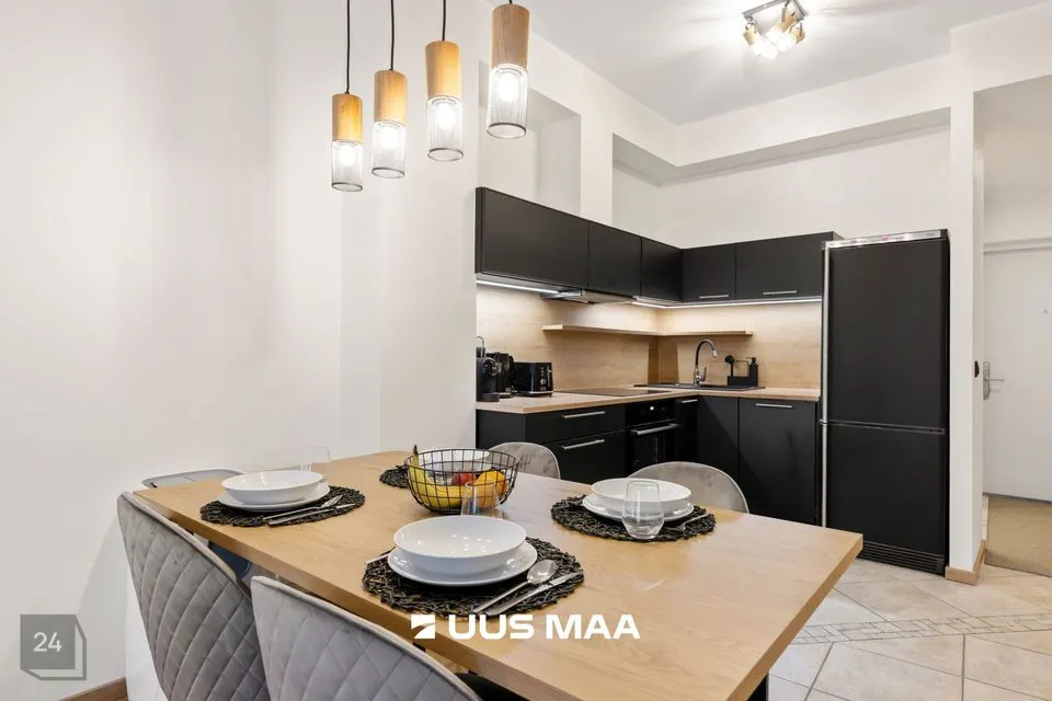 Köök koos maitseka köögimööbli ja kogu vajamineva tehnikaga: nõudepesumasin, ahi, induktsioonpliit, külmkapp. Vannituba-tualett koos dušinurga ja pesumasinaga.