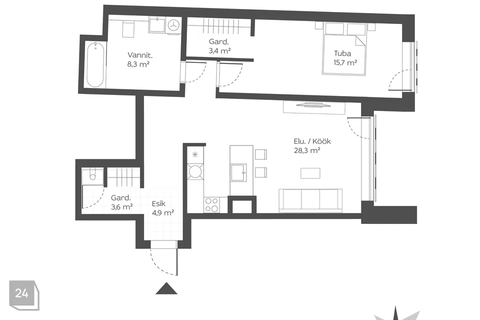 • Avar köök-elutuba koos köögisaare ja kvaliteetse tehnikaga.