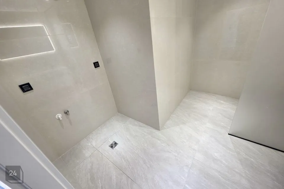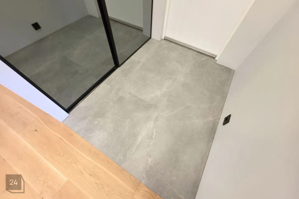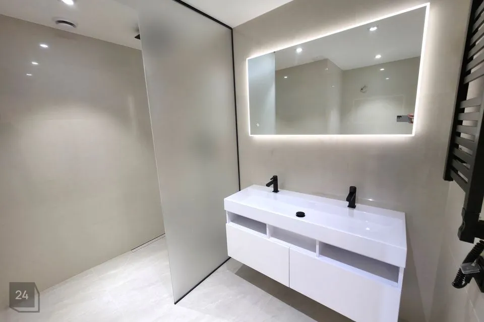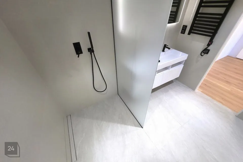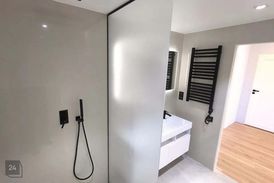 Seinaplaadid vannitoas (40x40 cm), põrandaplaadid (120x60 cm), suur 110 cm laiune dušinurk.