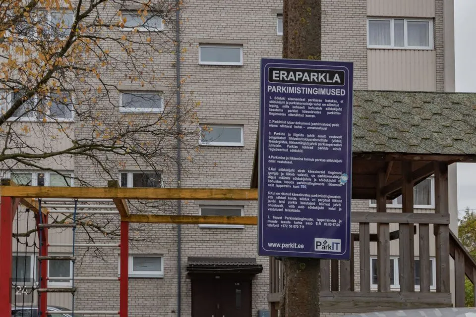 Maja ees on lapseplats ja asfalteeritud parkla.
