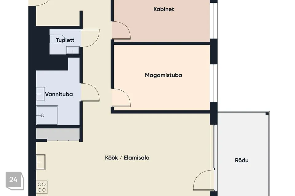 Korteri koosseisu kuuluvad: avatud köögiga elutuba, kaks magamistuba (hetkel on ühest tehtud kontoriruum), eraldi vannituba ja tualettruum, esik ning rõdu, kuhu pääseb elutoast.