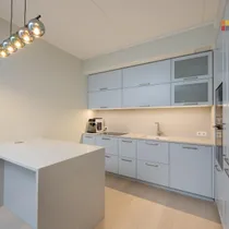 Töötasapind on 30 mm paksune kvartsist Alpine Mist, mida täiendavad kvaliteetsed MDF-kapid ja nutikas LED-valgustuslahendus – ribad nii kappide all kui sees, mis süttivad automaatselt uste avamisel.