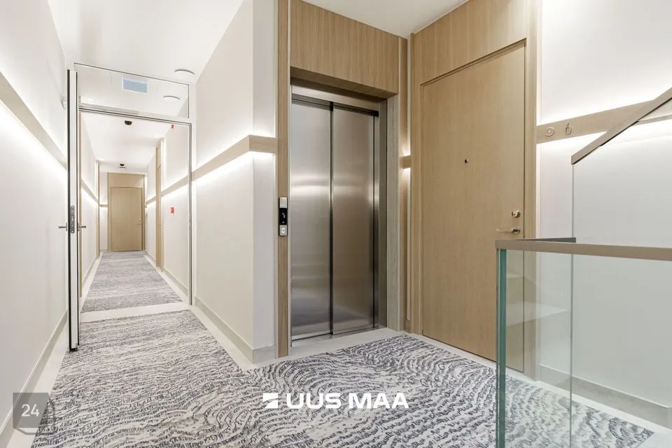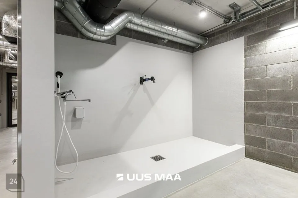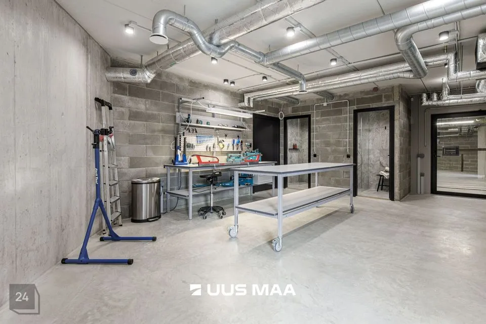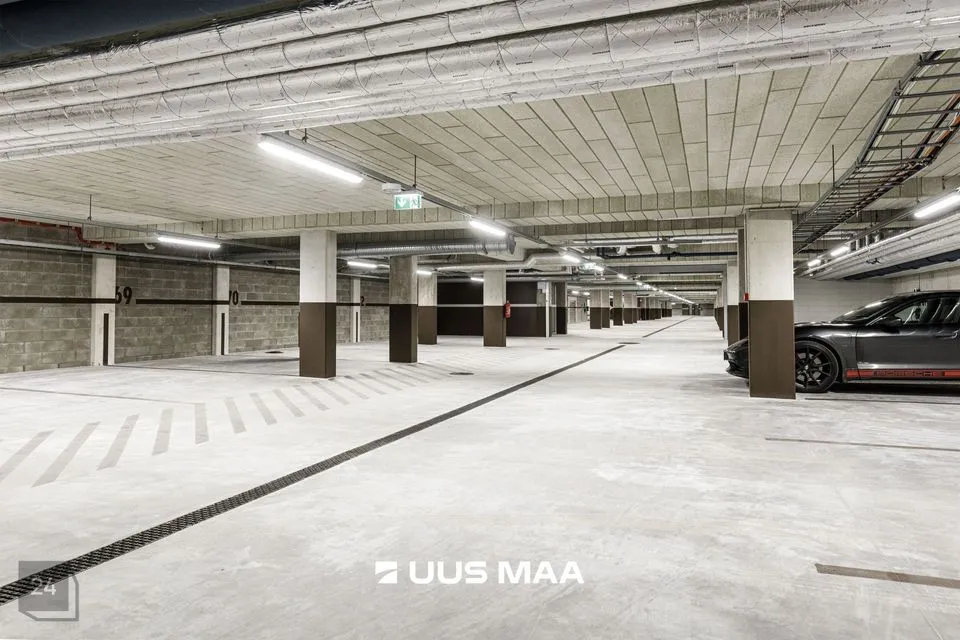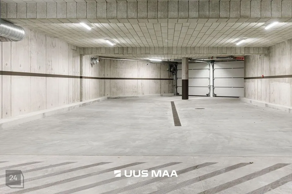 Korteri juurde kuulub 1 maa-aluses küttega garaažis asuv tavapärasest veidi laiem, 2,7 meetrine parkimiskoht ja panipaik. Maa-alusel korrusel asub ka mugavasti ligipääsetav ligi 40 m2 suurune elanike hobivarustuse pesu ja hooldamist võimaldav hobiruum.