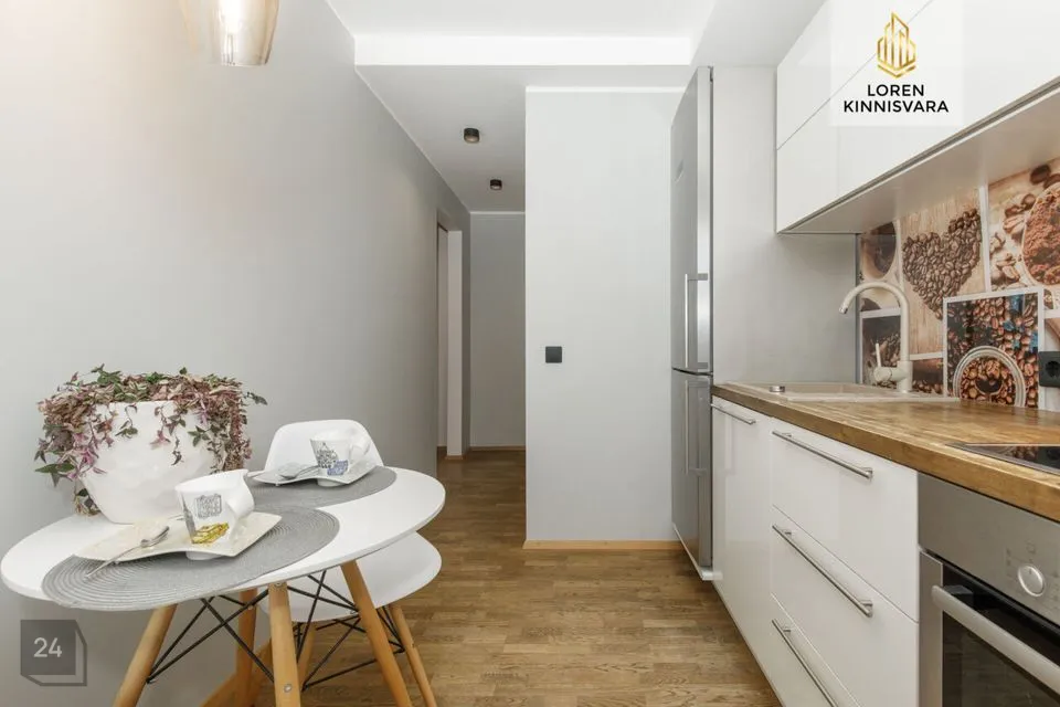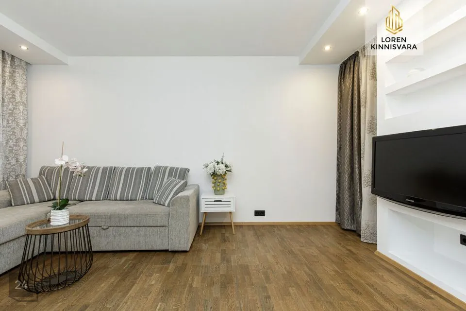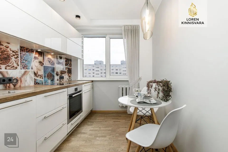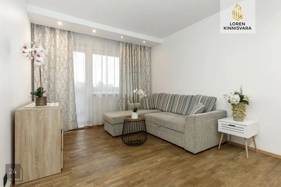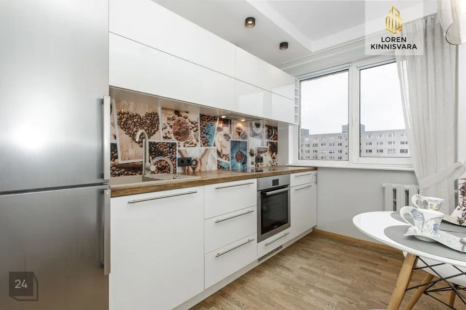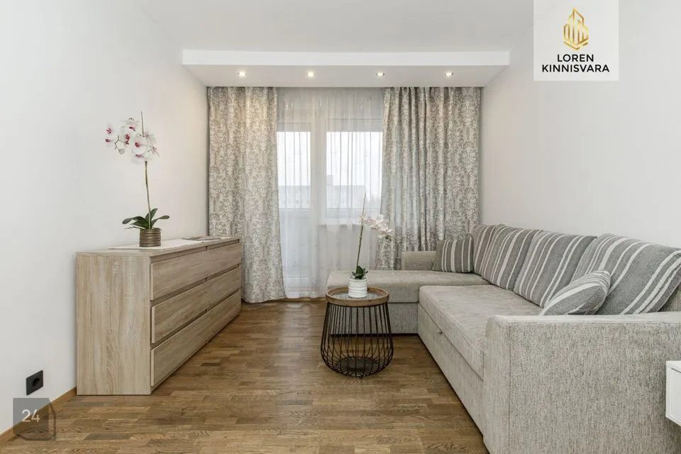 Müüa kaunis 2-toaline korter, mis asub 9-korruselise maja 7 korrusel. Korteris on esik, elutuba, magamistuba, köök, vannituba ja wc. Kõik toad asetsevad eraldi, mis teeb elamise mugavaks. Korterisse sisenedes jõuate esikusse, kuhu saab jätta jalatsid ja üleriided. Järgnevalt asub valgusküllane elutuba, magamistuba ja köök. Korteri siseviimistlus on heledates toonides ja sisustatud minimalistlikult. Elutoas on diivan, TV ja suur garderoobikapp. Elutoast pääseb klaasitud rõdule, kust avaneb imeline vaade linnale. Elutoas ja magamistoas on kvaliteetne tammeparkett, mis loob sooja ja kutsuva atmosfääri. Magamistoas on suur voodi ja kapp. Eraldi köök koos köögimööbli ja Boschi tehnikaga (külmkapp, elektripliit, ahi). Vannituba/wc on plaaditud Villeroy & Boch keraamikaga ning paigaldatud on Grohe sanitaartehnika. Mugavust lisab elektriline põrandaküte vannitoas. Aknad asetsevad hoovi poole, tänu millele ei ole kuulda tänavamüra. Müügihind sisaldab kogu mööblit ja tehnikat, mis teeb uue kodu ostmise eriti mugavaks.