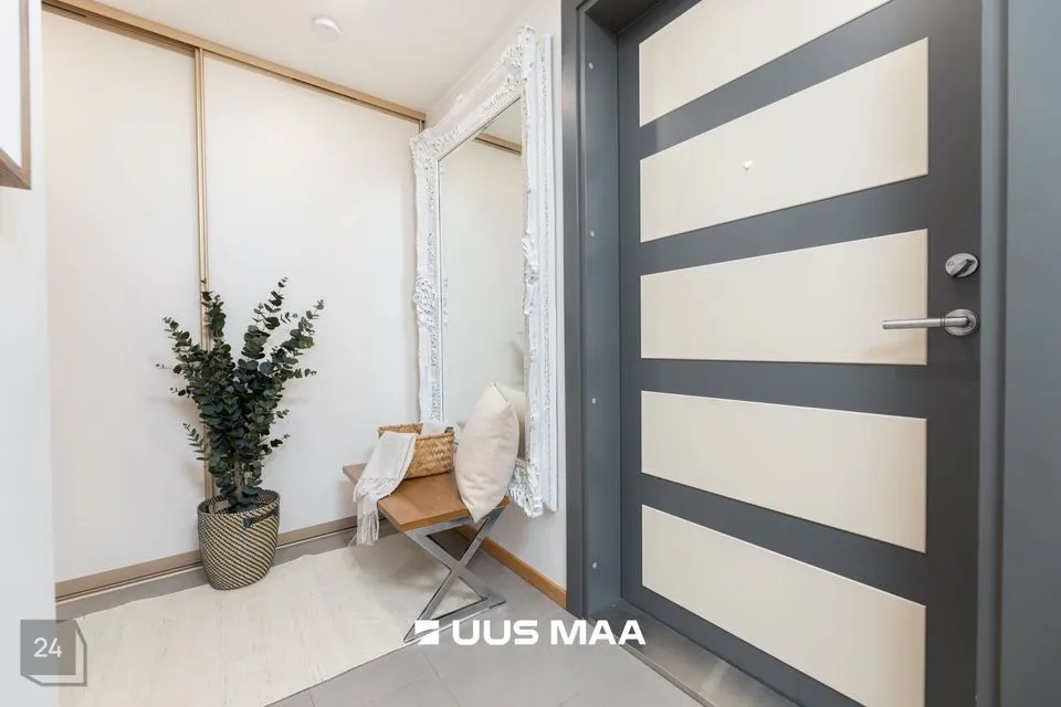 Korter on huvitava tasapinnalise lahendusega: elutuba avatud köögiga ja väiksem magamistuba on ühel tasandil, suurem magamistuba, pesu- ja majapidamisruum poolkorruse võrra kõrgemal. Avar esik koos kolmanda garderoobikapiga toimib mugava vahe- ja garderoobitsoonina.