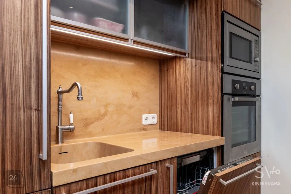 Tööpind ja köögitaust on valmistatud tehiskivist.
