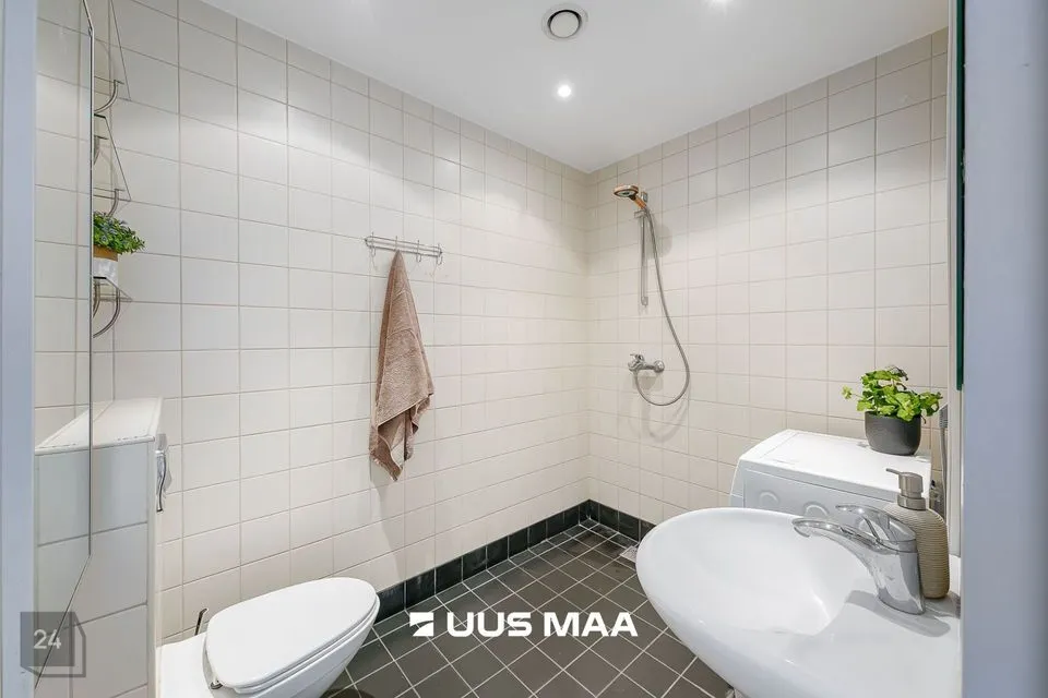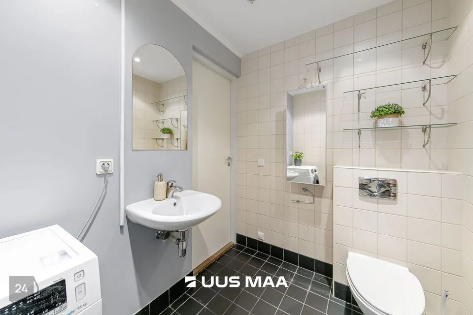 Põrandaid katab naturaalne õlivahatatud tammeparkett, vannituba on plaaditud ja on reguleeritava elektrilise põrandakütega.