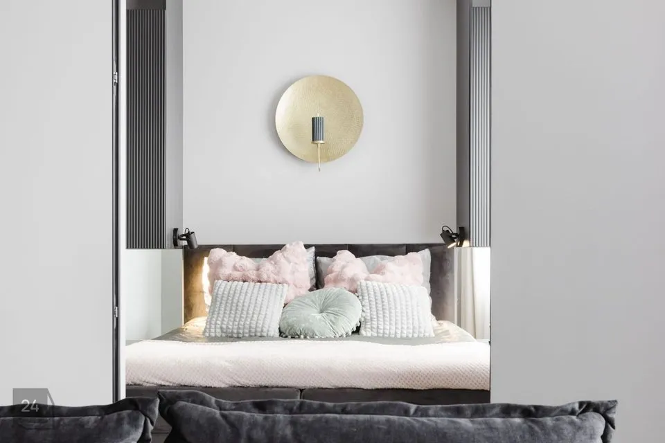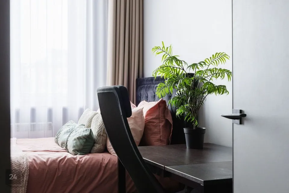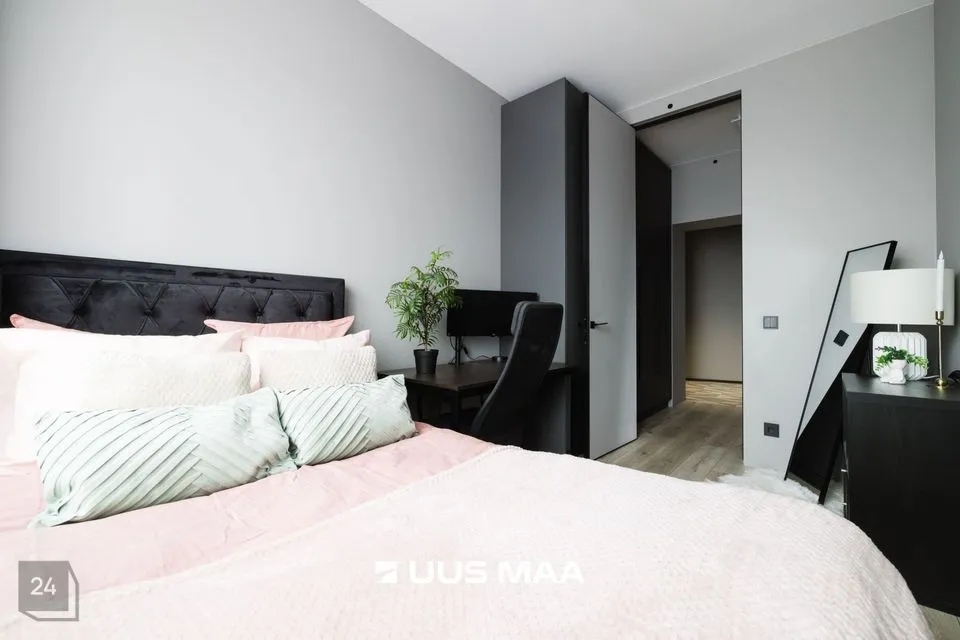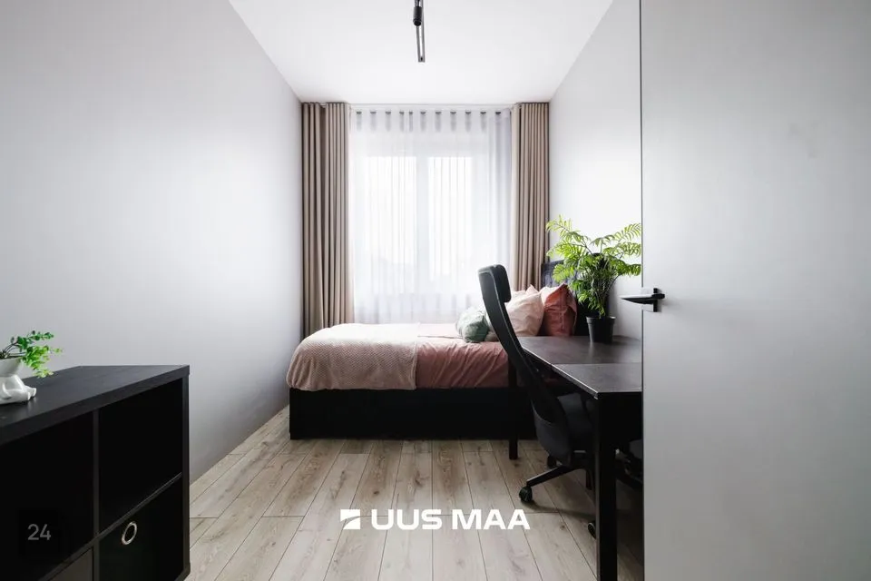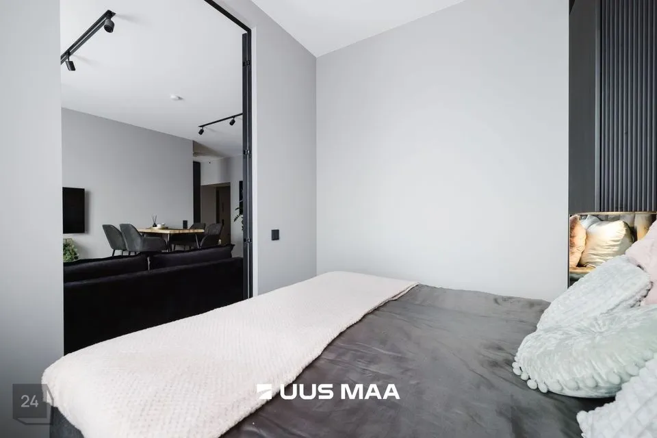 Esikust edasi liikudes jõuame esimesse magamistuppa. Piltidel on selles magamistoas kaks eraldiseisvat voodit, kuid hetkel on toas üks voodi ning kodukontori nurk. Teine magamistuba jääb elutoa teisele küljele ning on sisustatud suure voodiga. Kahe magamistoa vahele jääb elutuba, mille juures on ka väga ilus avatud köök. Kohe köögi kõrval on suur ja luksusliku ilmega vannituba.