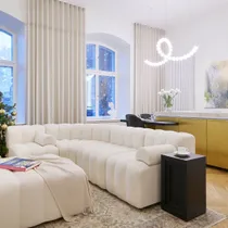 Kõrgete kaarakendega elutuba-köök täidab ruumi loomuliku valgusega ning pakub elegantsi ja õhulisust.