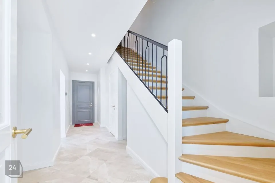При входе в квартиру вас встречает просторная прихожая, в которой достаточно места для гардеробного шкафа. По левую руку расположен гостевой туалет, что добавляет удобства в быту. Далее прямо расположен кабинет, предоставляя личное пространство для работы или учебы. Красивая лестница, берущая начало в прихожей, ведет на верхний этаж.