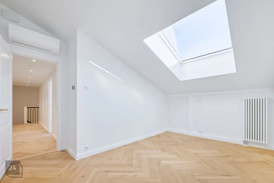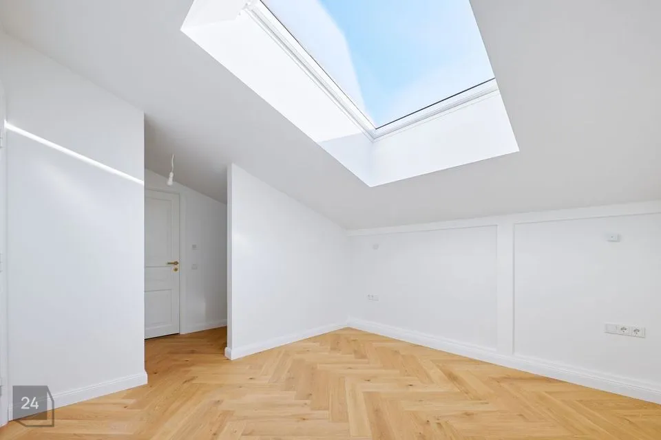 На верхнем этаже расположена главная спальня с просторной гардеробной, далее вас ждет большая ванная комната с возможностью размещения бытовой техники. Кроме того, на втором этаже находится еще одна уютная спальня с наклонным потолком и мансардным окном, создающим неповторимую атмосферу. Вторая ванная комната с душевым уголком дополняет функциональность и комфорт квартире.
