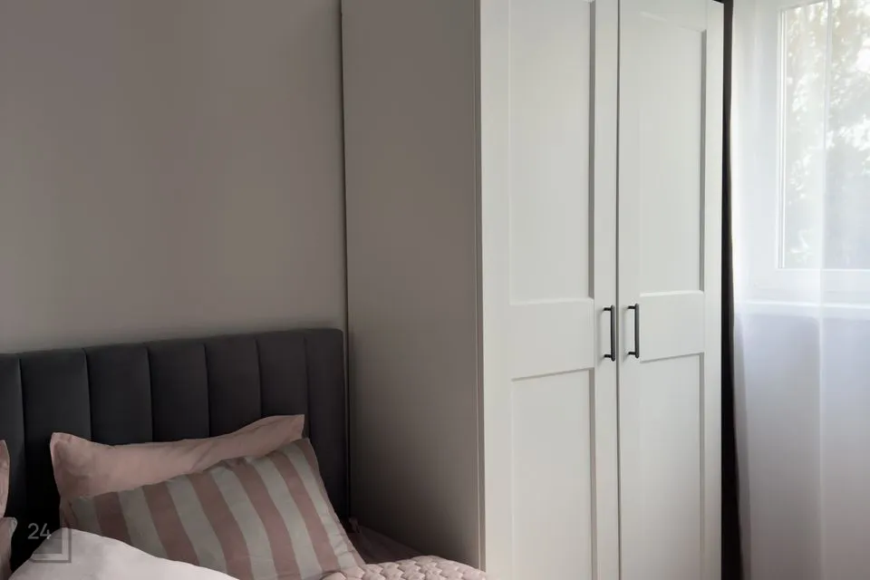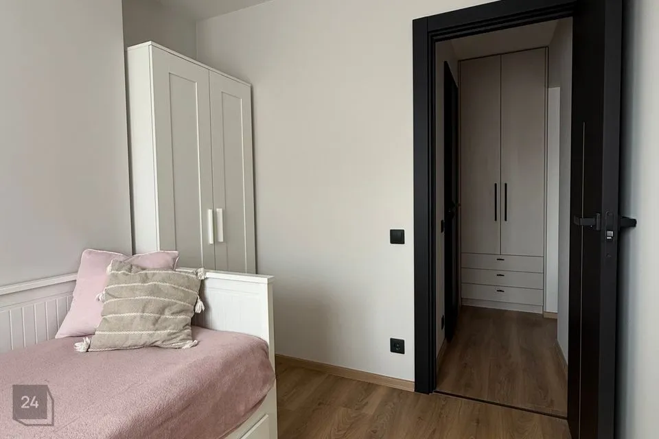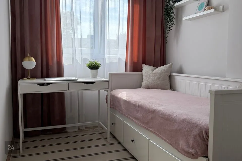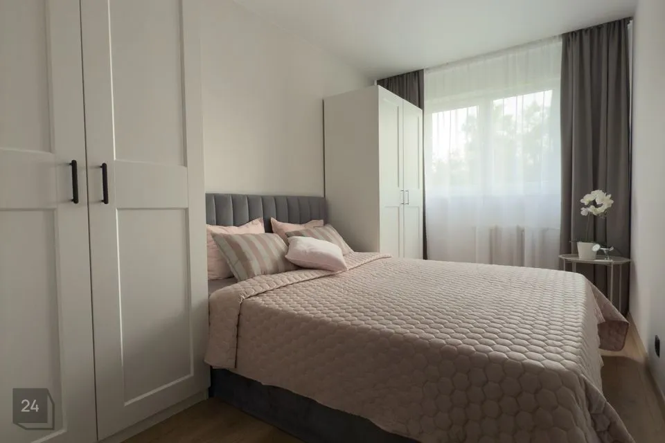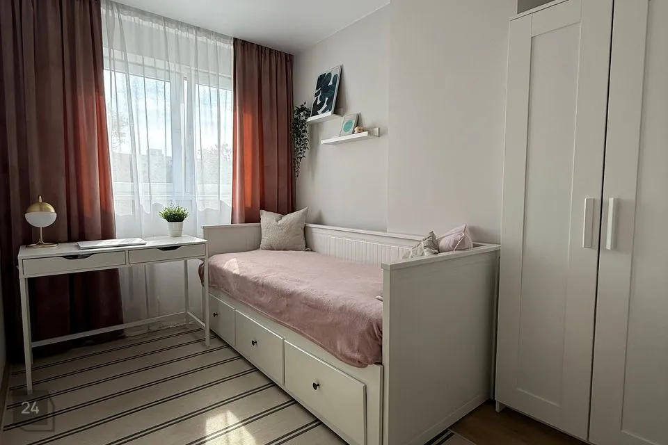 • Bedroom: bed with lifting mechanism, storage space under the bed. IKEA cabinets 1 meter long on both sides of the bed.