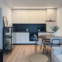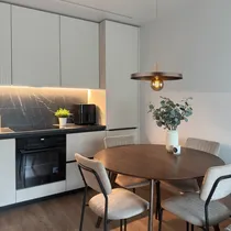 • Kitchen-Living Room: spacious and light-filled room, combined living area and kitchen. Custom-made kitchen furniture from quality materials. The open kitchen has space for a dining table and a comfortable relaxation area.