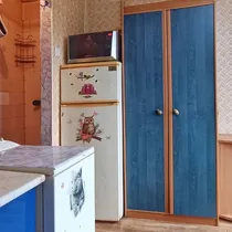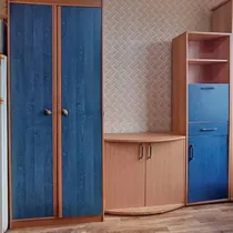 The apartment has a private toilet and shower. The room has a couch, cabinets, table, kitchen sink cabinet, washing machine and refrigerator. The furniture and home appliances in the apartment are in poor condition. The apartment window needs repair or replacement.