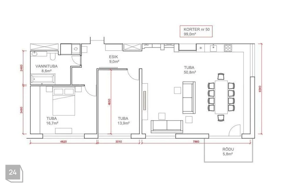 99 ruutmeetri peale on on mõnusalt ära mahutatud 2 magamistuba, avar pesuruum ning eelnimetatud avatud köögiga suur elutuba. Elutoast on ka pääs rõdule, mille suuruseks on 5.8 m2.