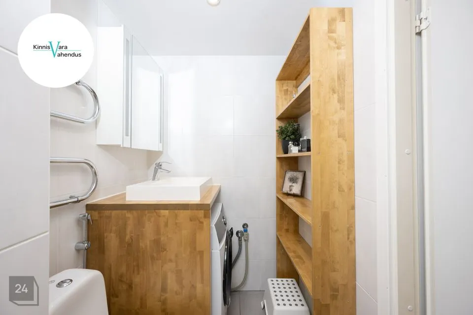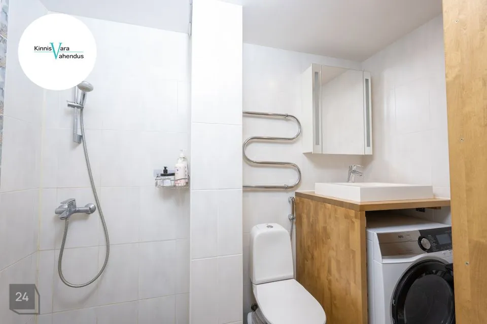 vannituba/ wc, kus on dušš ja tänu praktilisele lahendusele on sinna koha leidnud ka pesumasin;