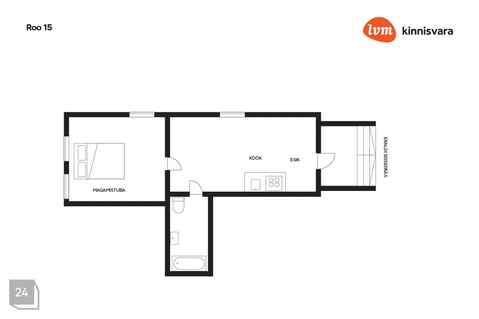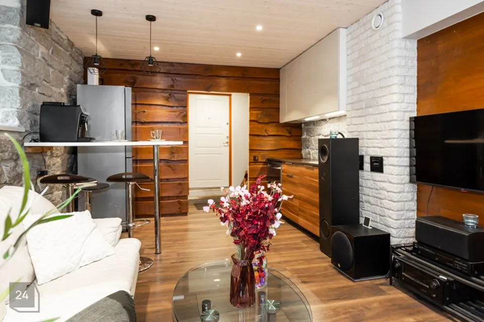 Korteril on hoovipoolne eraldi sisspääs, korter asub soklikorrusel. Mõistliku suurusega esikuosa, elutuba avatud köögiga, paksude kiviseintega eraldatud magamistuba ja vannitoas on vann/dush ja wc koos. Korter on soe ja kaasajastatud, aga seisukord on pigeem keskmine, värskendamistvajav. Tule vaata, oma silm on kuningas!