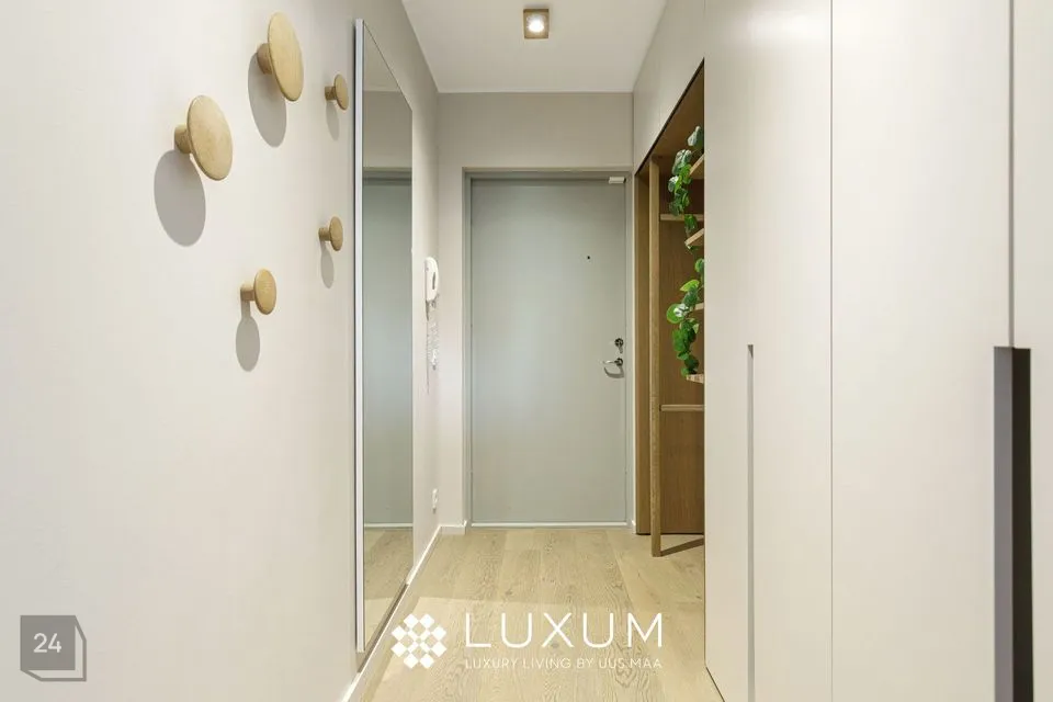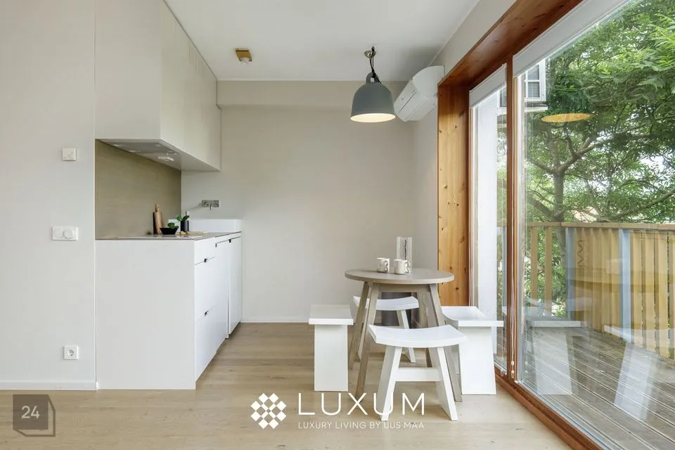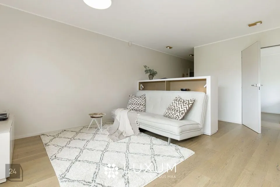 Korteri suurus on 47.1 m2, millele lisandub 8.7 m2 suurune rõdu. Esikus on mahukas sisseehitatud garderoob, elutoas asub seinakapp, mis mahutab hulgaliselt asju, mis ei peaks silma all olema, samuti on olemas diivan-voodi ja tv kapp. Minimalistlikus kööginurgas on integreeritud pliit, külmik ja pesumasin. Magamistuppa jääb voodi ja kummut ning duši all saab käia linnulaulu saatel, sest kui paljudes vannitubades on aken?! Siin on:) Ja kui suvel peaks liiga palavaks minema, siis mõnusat jahutust pakub konditsioneer.