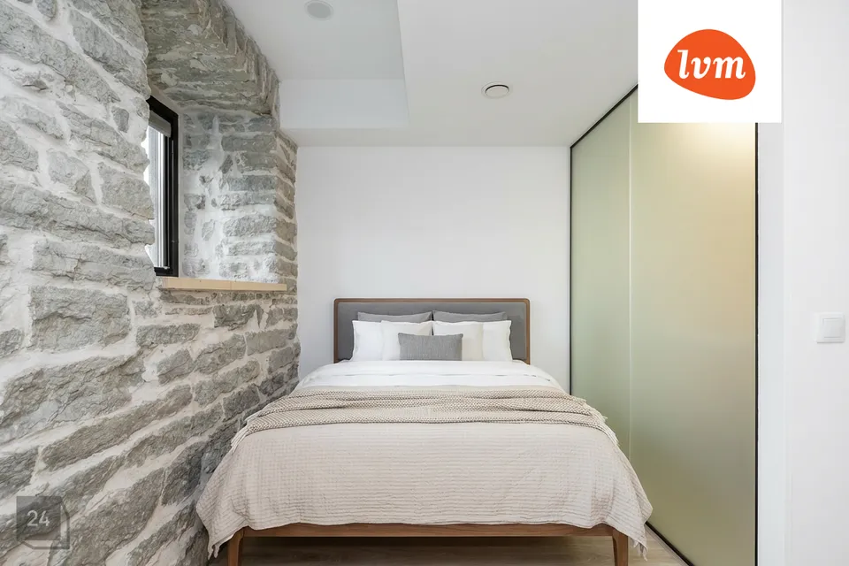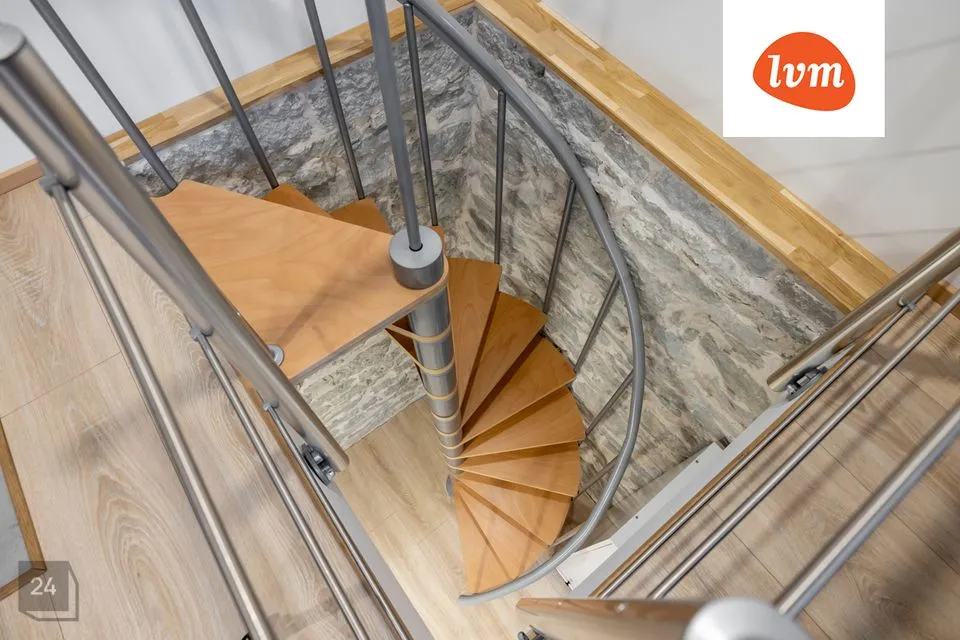 Spiraaltrepp viib alumisele tasapinnale, kus on magamistuba ning eraldi vannituba. Soklikorruse paekiviseinad ja klaasitud sein lisavad ruumile iseloomu.