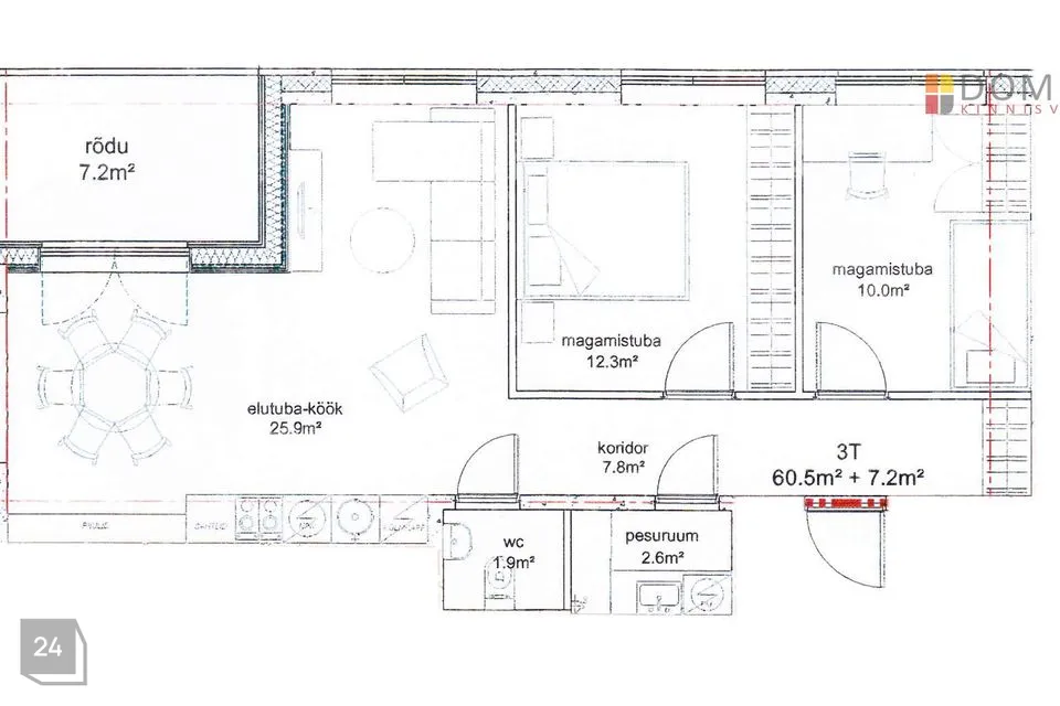 Korteriomandi üldpind on 67,7 m², millest korteri suletud netopind on 60,5 m² ja rõdu 7,2 m².