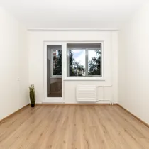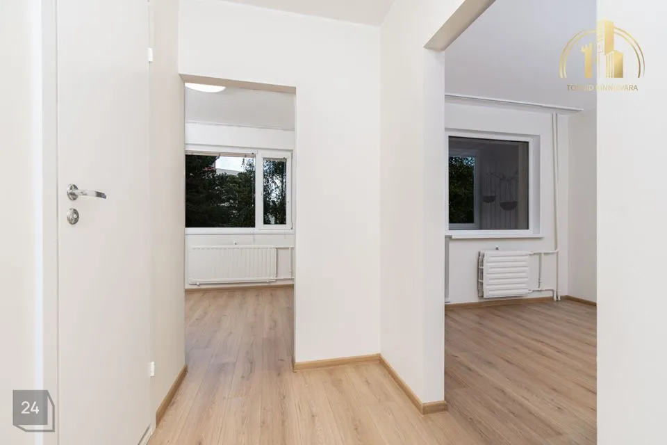 Korteri põrandat katab laminaatparkett, seinad sirgendatud, aknad on vahetatud.