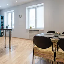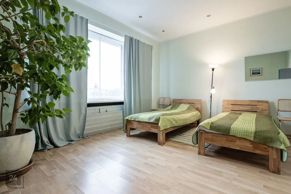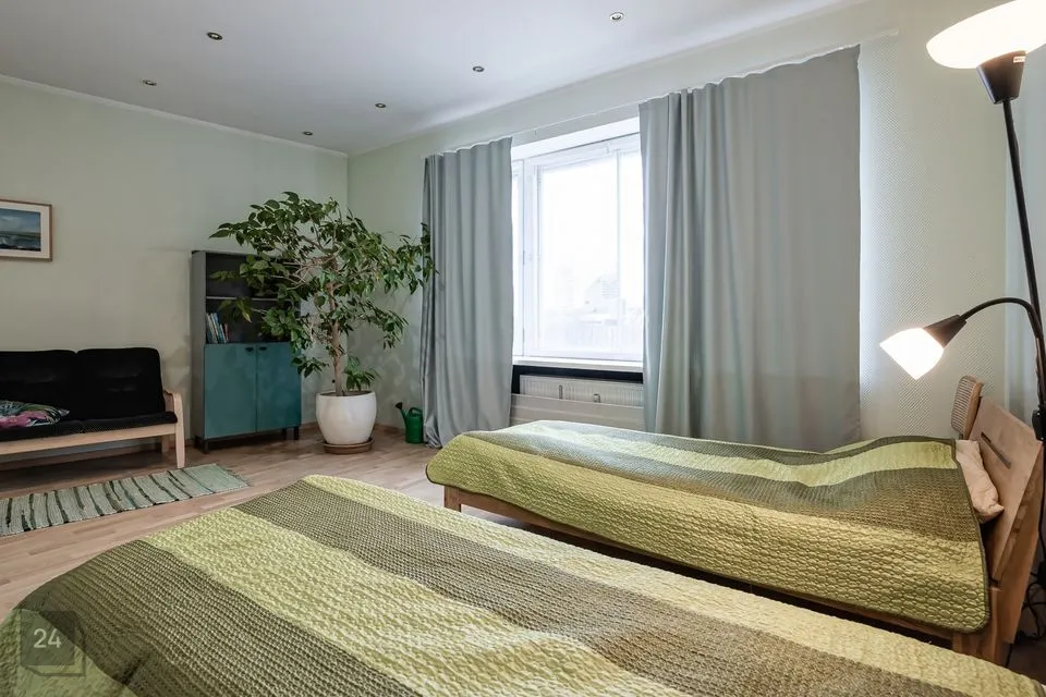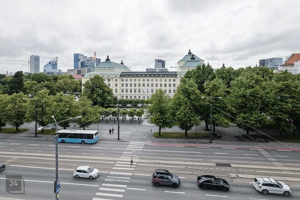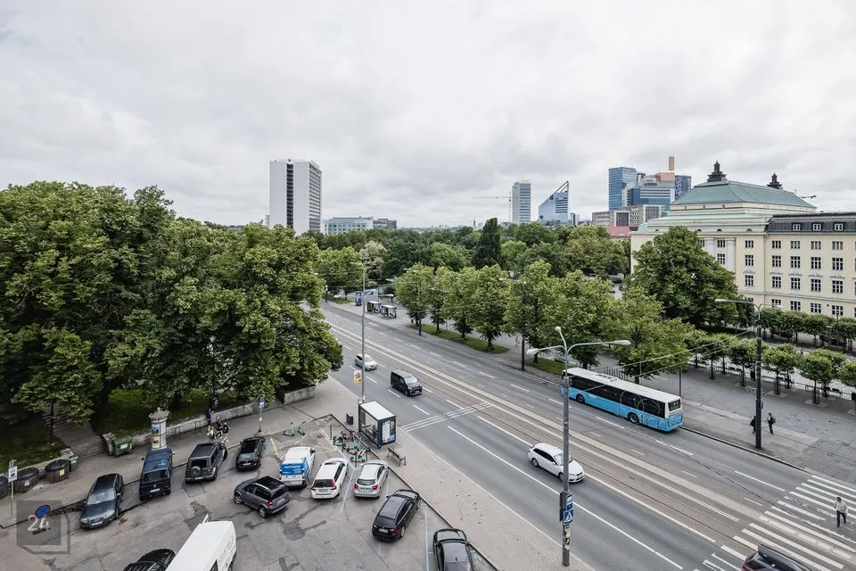 В состав квартиры входят: пять комнат, кухня, санузел и просторный коридор. Квартира имеет сквозную планировку. Каждый вид завораживает: с одной стороны открывается великолепная панорама Национальной оперы Эстонии, Драматического театра и парка Таммсааре, с другой стороны – красивые виды на Старый город.