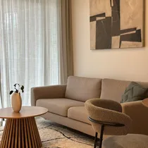 Stiilne diivan, millel istudes saab jälgida kvartali sisehoovi või silma peal hoida köögil ja TV-l. Kohvilaud kuhu serveerida kohvi või marjatee. Väike kummut-kapp, mis mahutab dokumendikaustad. Elutoast pääseb rõdule.