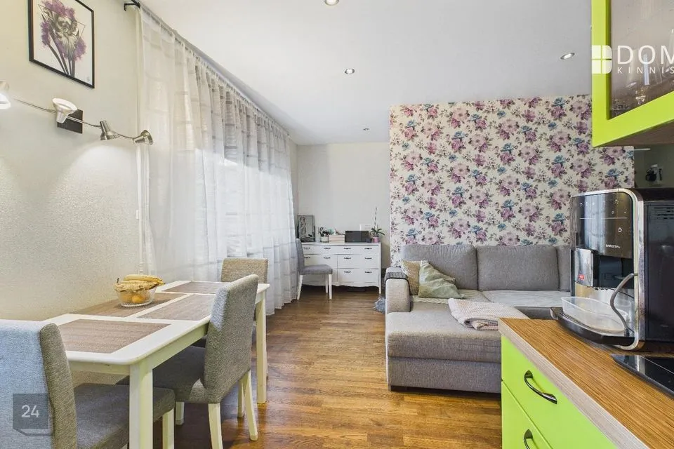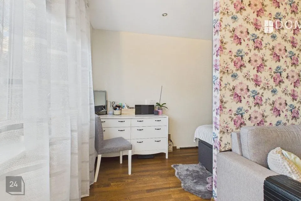 Korteri põrandaid katab naturaalne parkett, mis toob toob tubadesse soojust ja mõnusat kodutunnet. Seinad on värvitud heledas värvigammas ja osaliselt kaetud dekoratiivtapeediga. Suur magamistuba pakub rohkelt ruumi ning loob ideaalsed tingimused puhkamiseks ja heaks uneks. Elutuba on eraldatud kergseinaga kuhu on seeläbi tekitatud eraldi nurk kas kodukontori või magamisvõimaluse jaoks. Läbi-maja planeering tagab loomuliku valguse kogu päeva jooksul.