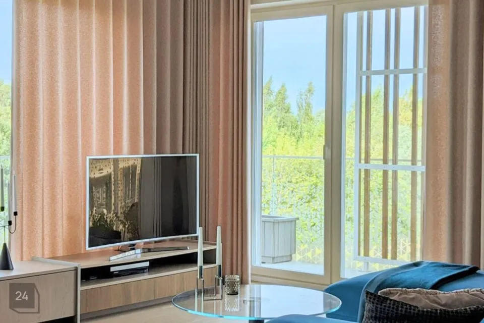 Korteris on kõrged laed ja maast laeni panoraamaknad.