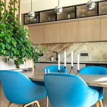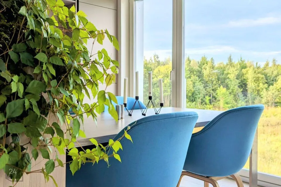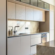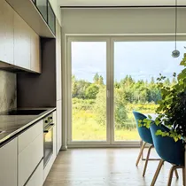 Stiilne nanotehnoloogial põhinev köögimööbel naturaalsest kvartsiidist tööpinnaga, köögitehnika tippbrändidelt: Liebherr, Falmec, Küppersbusch, Smeg, veinikülmik. Elutoas Treimanni täispuidust söögilaud, Softrendi pehme mööbel.