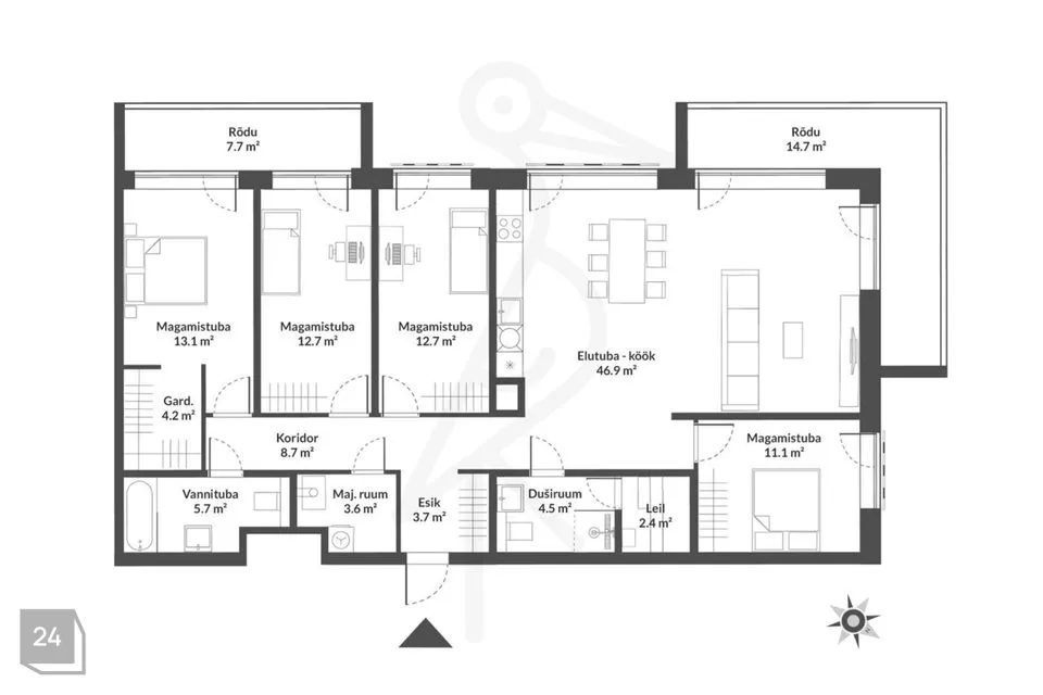 Korteri suurus on 129,4 m², millele lisanduvad kaks rõdu kogupindalaga 22,4 m².