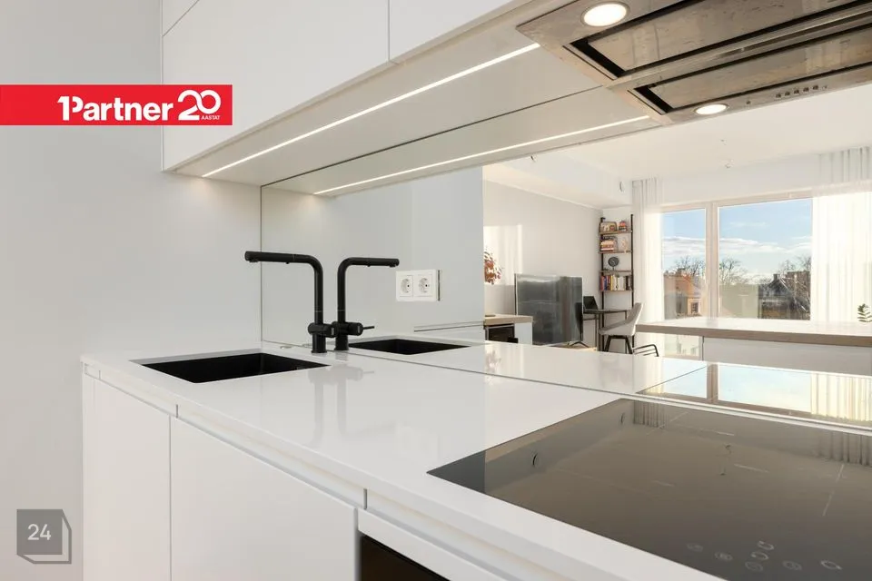 Selle viimase korruse korteri suurim väärtus avaldub juba aknast välja vaadates — vaade algab ajaloolise tuletõrjedepoo tornist ning jookseb sealt edasi üle kogu avatud kvartali.