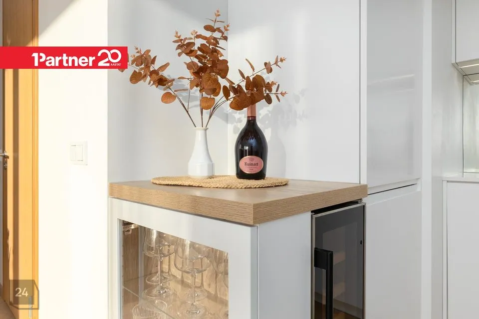 See köök on võrreldav suuremate korterite lahendustega — ruumikas, mugav ja visuaalselt väga puhas.
