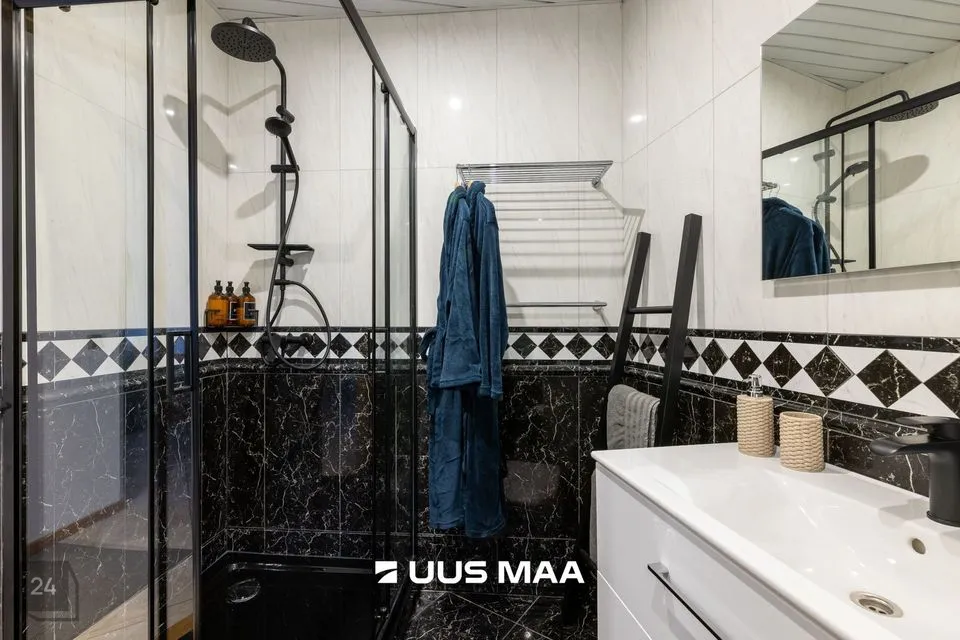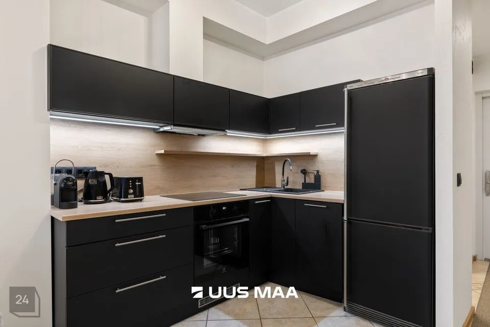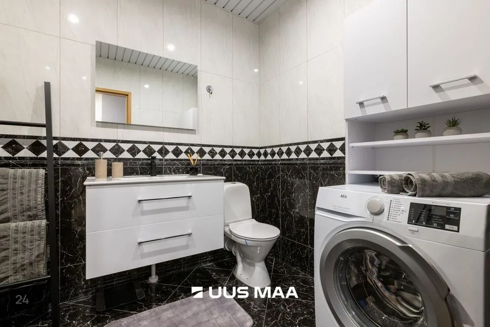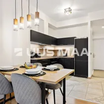 Köök koos maitseka köögimööbli ja kogu vajamineva tehnikaga: nõudepesumasin, ahi, induktsioonpliit, külmkapp. Vannituba-tualett koos dušinurga ja pesumasinaga.