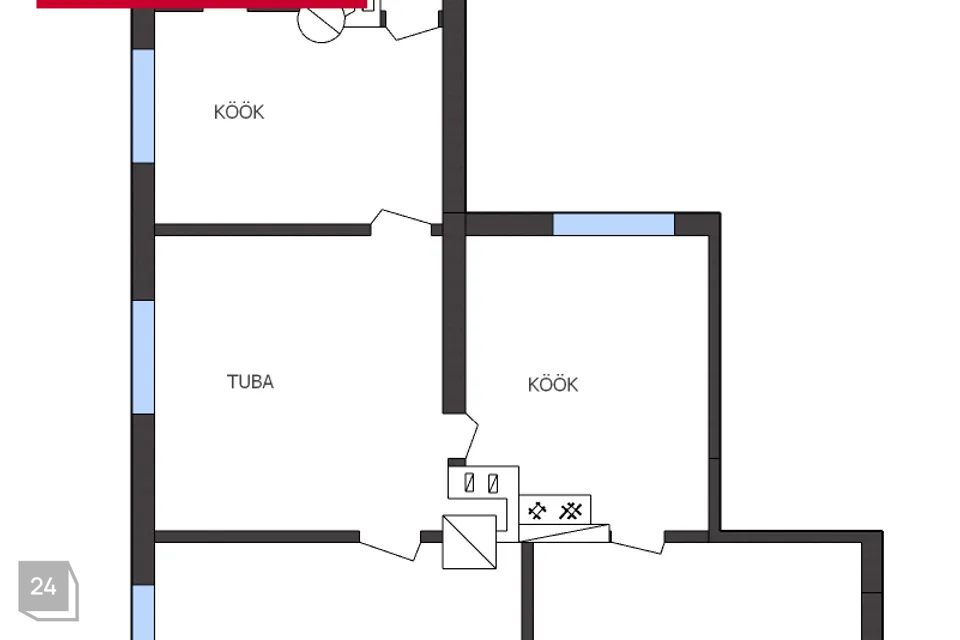 Korteris on kolm tuba ja kaks kööki – ühe köögi saab ümber ehitada lisatoaks. Omaette sissepääs. Аhjuküte. Müüakse olemasolevas seisukorras.