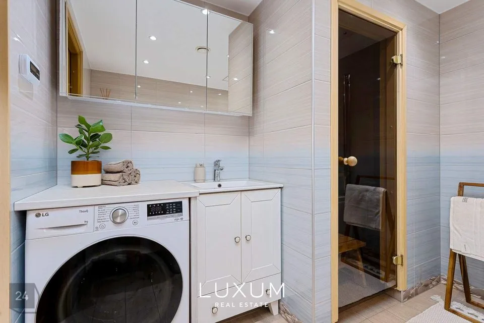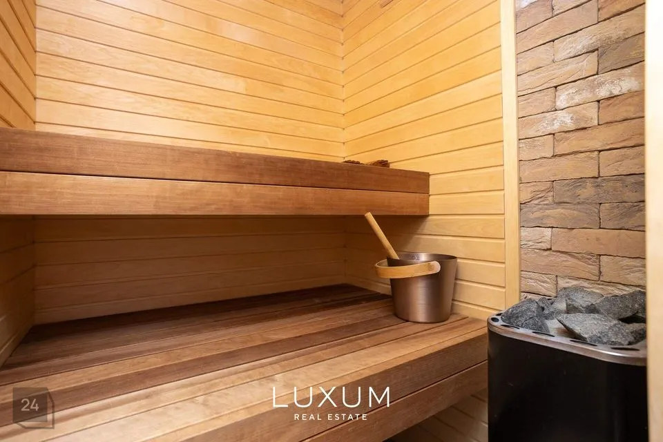 Korteris olev saun on ehitatud eritellimusel – saunalava on kvaliteetsest tumedast termopuidust. Laudis on haavapuust, kerise tagusesse seina on paigaldatud kvaliteetne kivivooder. Saunale annab korralikud kuumakraadid 6 kW Narvi elektrikeris.