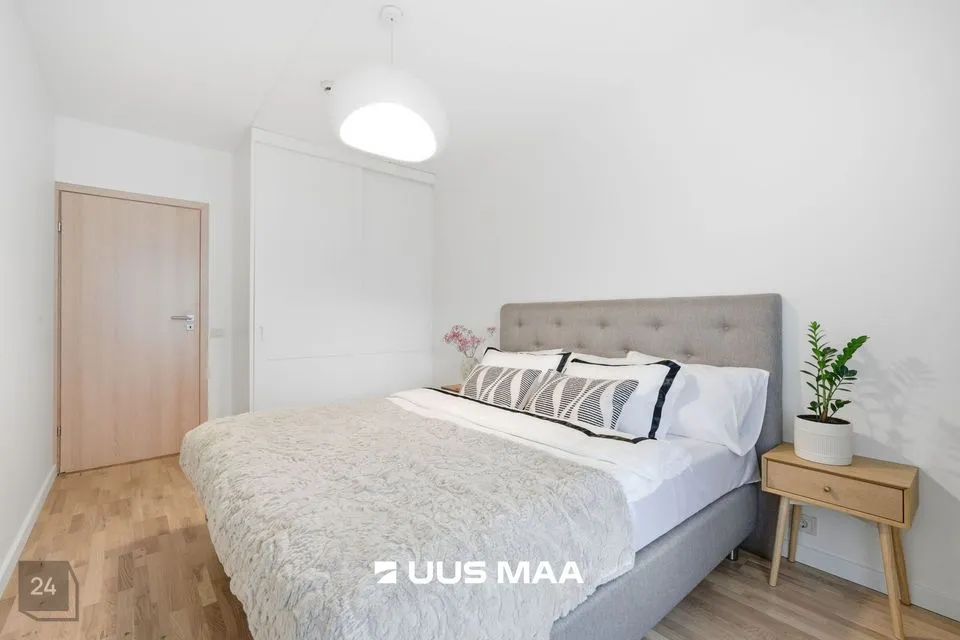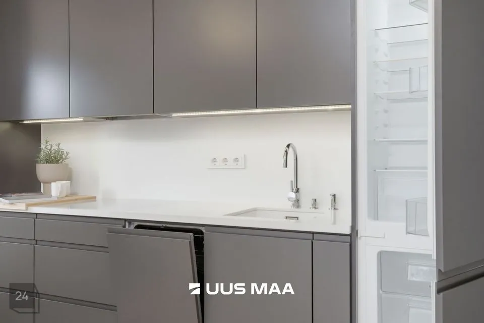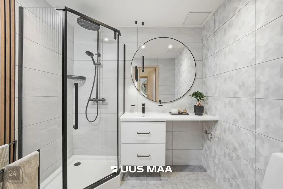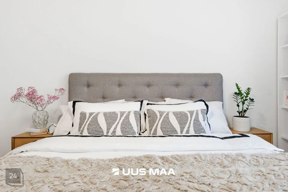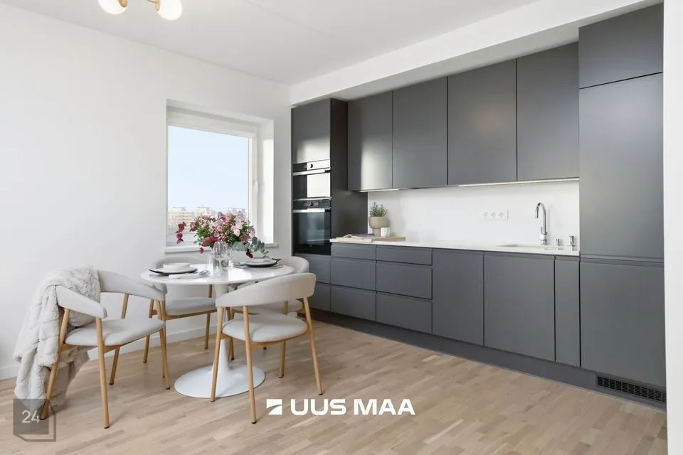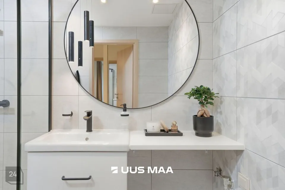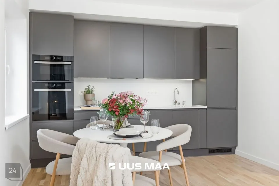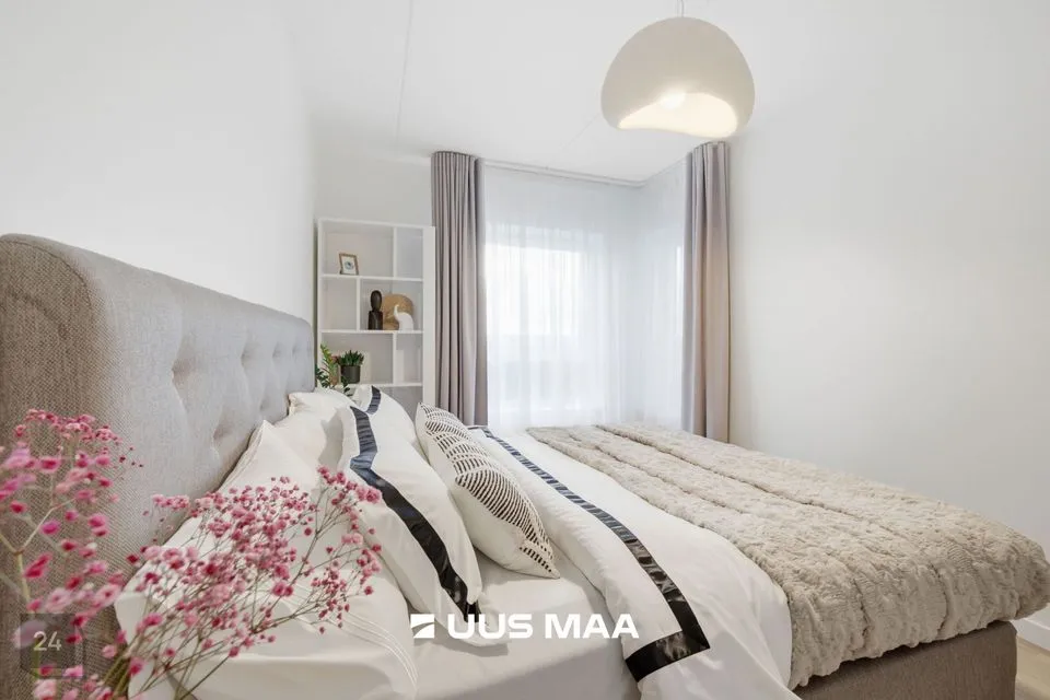 Kogu korter on viimistletud rahulikes pastelsetes toonides, mida tasakaalustavad tumedamad detailid. Tulemuseks on ajatu ja maitsekas tervik.