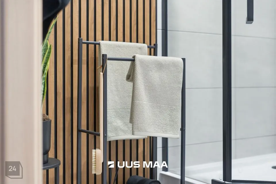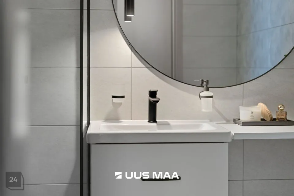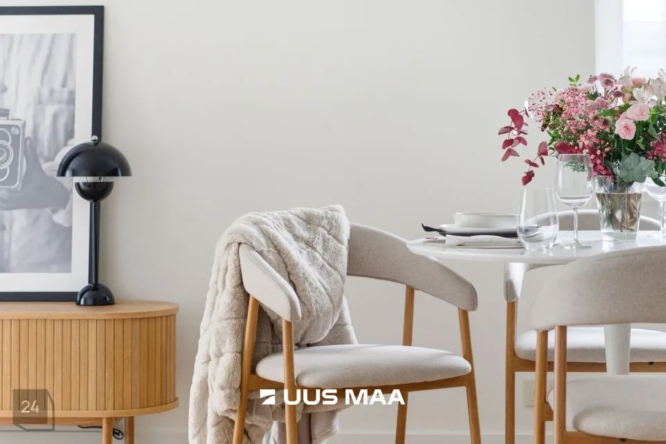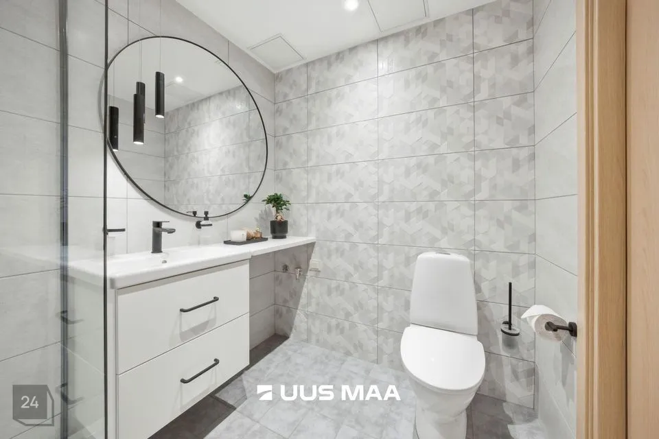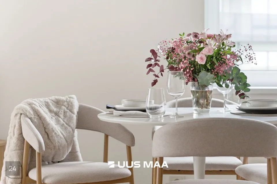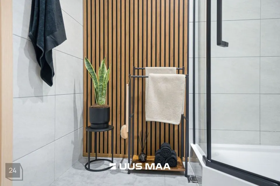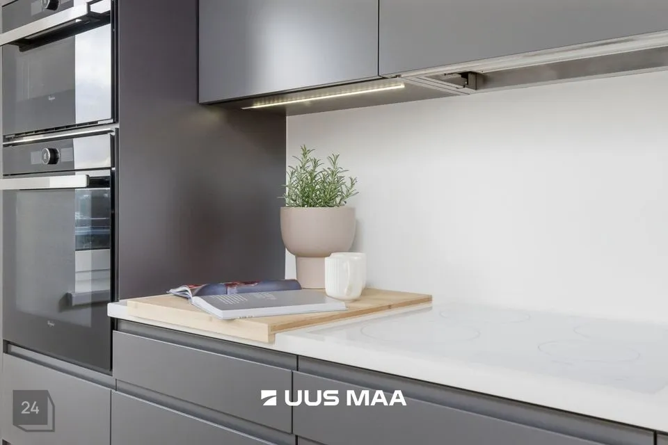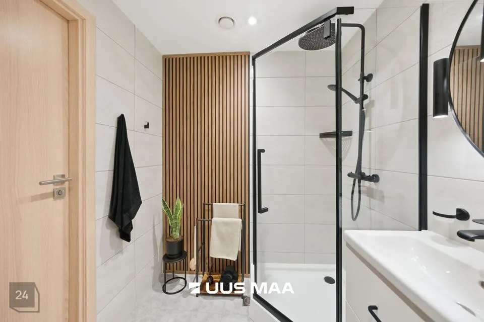 Kogu korter on viimistletud rahulikes pastelsetes toonides, mida tasakaalustavad tumedamad detailid. Tulemuseks on ajatu ja maitsekas tervik.