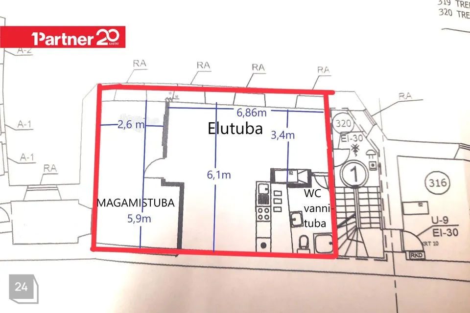 Korteri koosseisu kuulub avatud köök-elutuba, magamistuba ja wc-duširuum. Esikus ja magamistoas lükandustega ruumikad garderoobikapid. Põrandaid katab naturaalne tammeparkett.