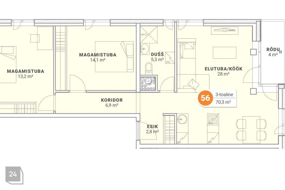 Elutuba ja avatud köök moodustavad funktsionaalse keskosa, kus ruumide proportsioonid on hästi läbi mõeldud. Köögiala ja köögisaar jagab suure ruumi elutoaks ja söögialaks: üksteisest natukene eraldatud, kuid samas piisavalt lähedal, et sõprade, pere või sugulastega (natukene suurema seltskonnaga) nautida üheskoos hubaseid sügis- ja talveõhtuid. Elutoas on ka pääs 4m2- suurusele rõdule.