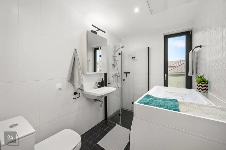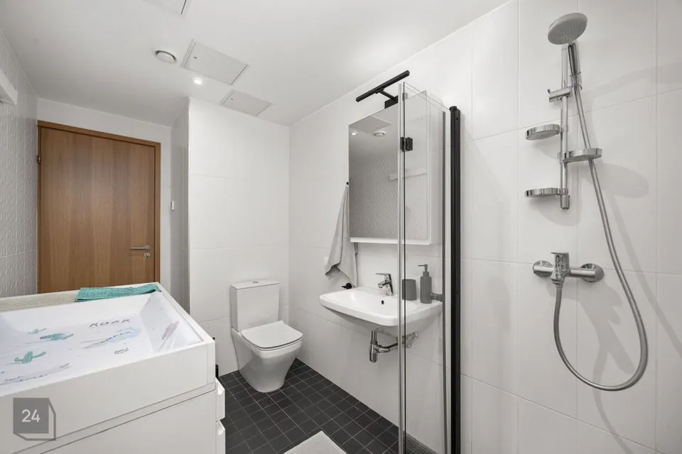 Vannituba on kompaktne ja praktiline. Olemas on dušš, kraanikauss, tualett ning koht pesumasinale, mis on integreeritud kummut/mähkimislauaga. Boonuseks on aken loomuliku valgusega.