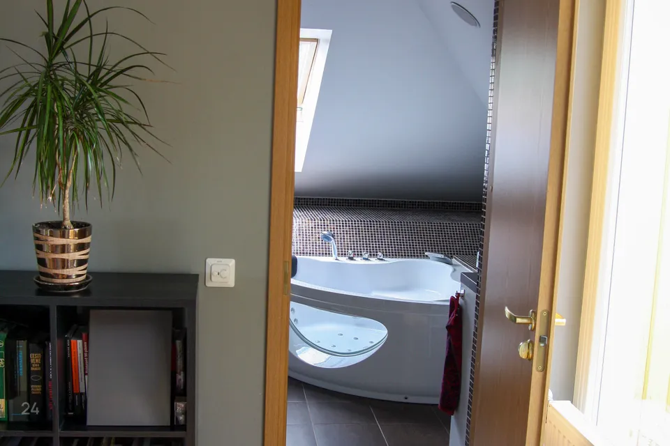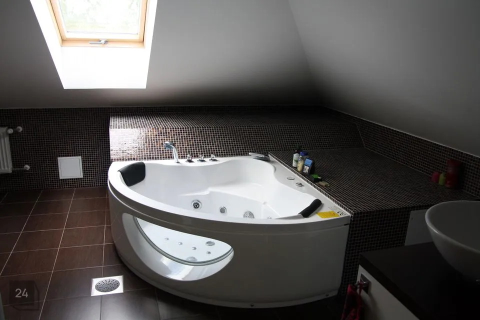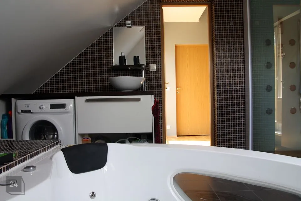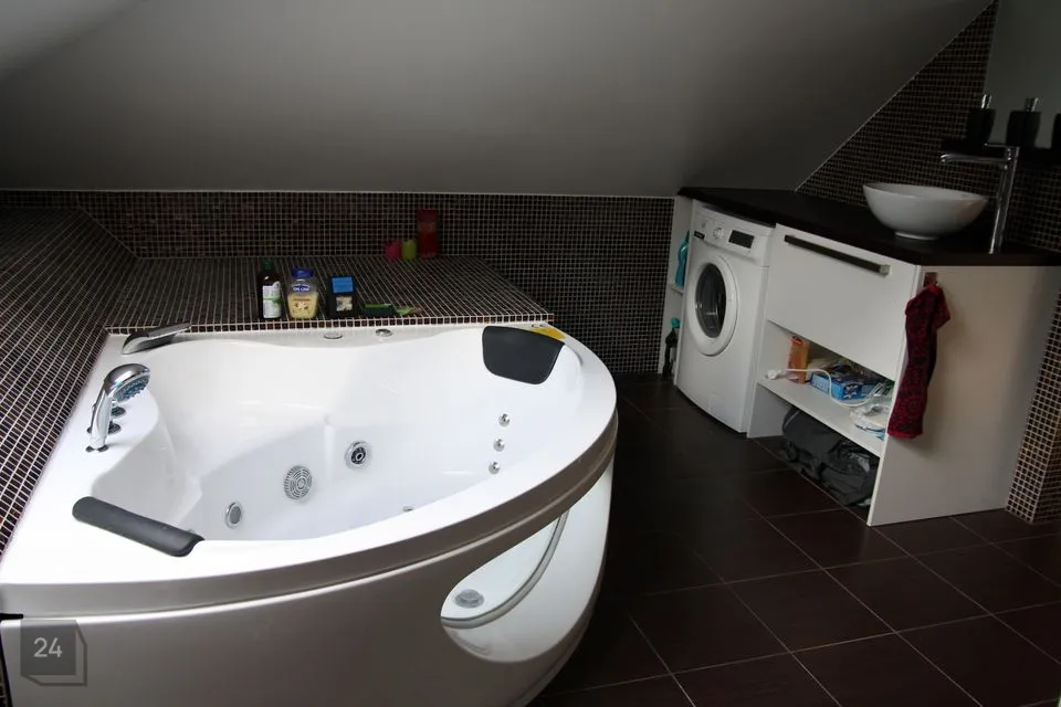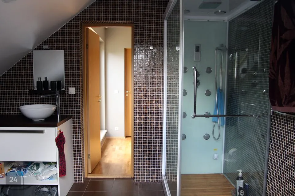 - Eriti ruumikas vannituba, mis on seda sõnaosa “tuba” igati väärt. Kõik seinad on kaetud pruunika mosaiikplaadiga.