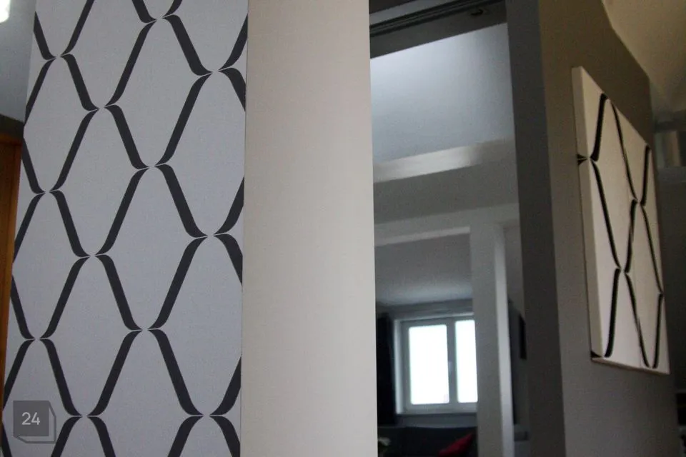 - Esikust kaunistab kaheosaline maal, mis imiteerib suurendatult elutoa tapeedi mustrit, moodustades elutoa ja esiku vahel ühtse terviku.