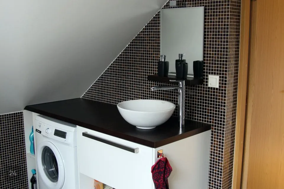 - Valamunurgas on Arensi eritellimusmööbel, mis sisaldab pesumasinat, mahukat vaikselt sulguvat sahtlit, riiuleid ja sellepealset suurt töötasapinda. Lisaks pinnapealne kauss-valamu ja segisti, riiul ja valgustusega peegel.