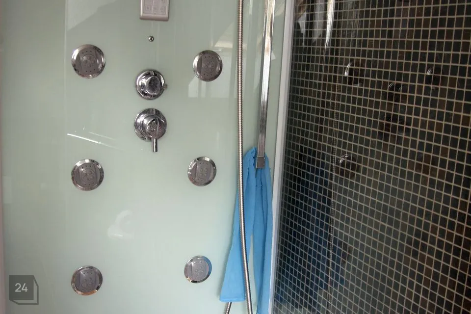 - Schönbergi eridisaini ja puitimitatsiooniga põrandaga dušikabiin-aurusaun laeduši, käsiduši, külgmiste massaažidüüside, raadio, välise audiokanali ühendamise võimaluse ja valgustusega kabiin, mis sobib igapäevaseks duši all käimiseks, kuid mida ühe nupulevajutusega saab kiiresti muuta lõõgastavaks aurusaunaks.