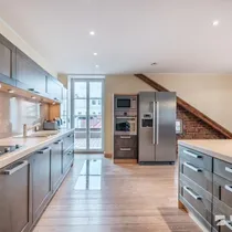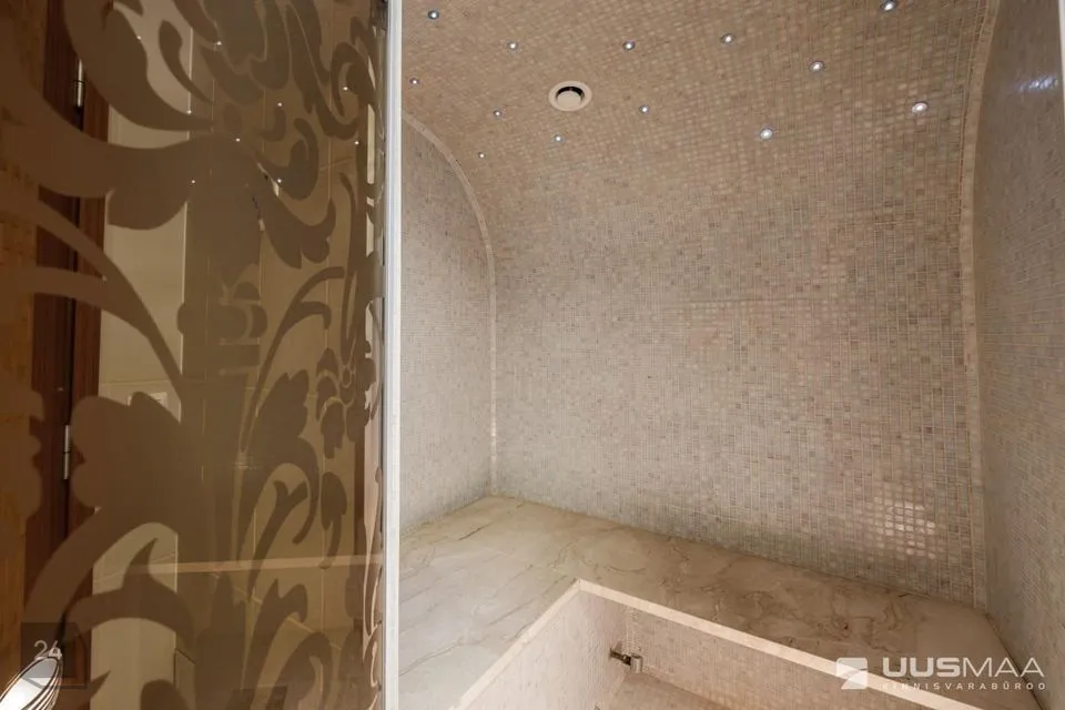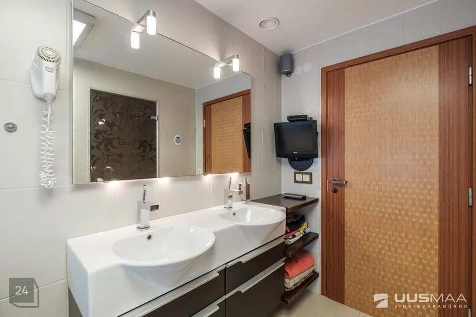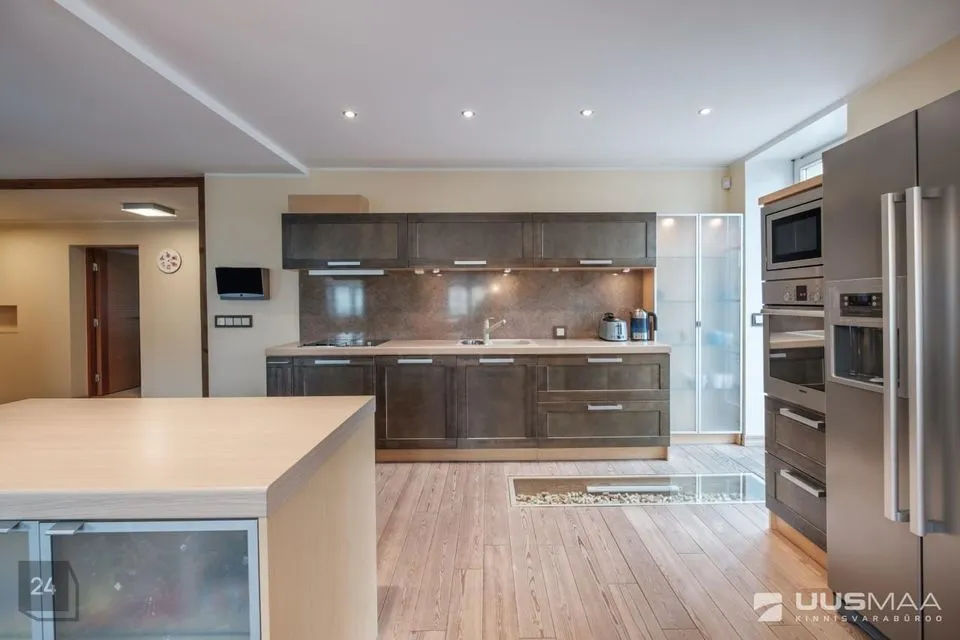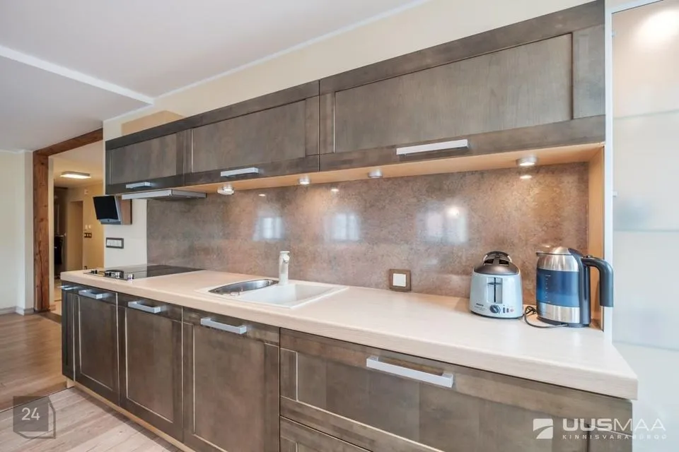 Korteris on laudpõrandad (täispuit lehis), seinad on värvitud või tapeeditud. Köögis on Arensi köögimööbel ja vannitoas Duraviti tehnika. Elutoas on gaasikamin.