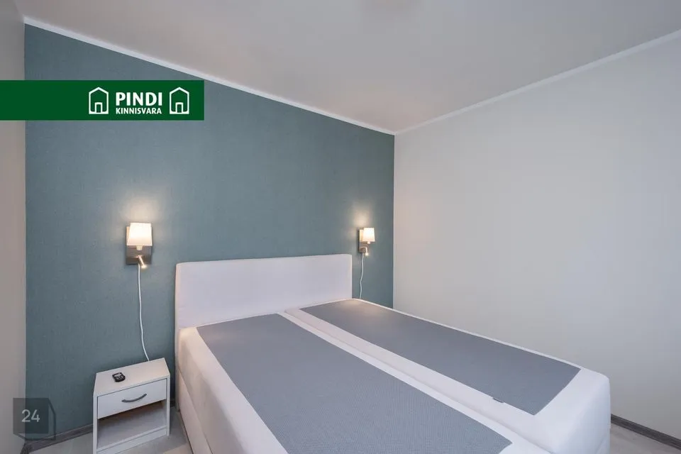 Elutoas on lahtikäiv diivan ja televiisor. Magamistoas suur voodi ja teises magamistoas on mahukas kapp. Seintel tapeet, põrandal laminaat.